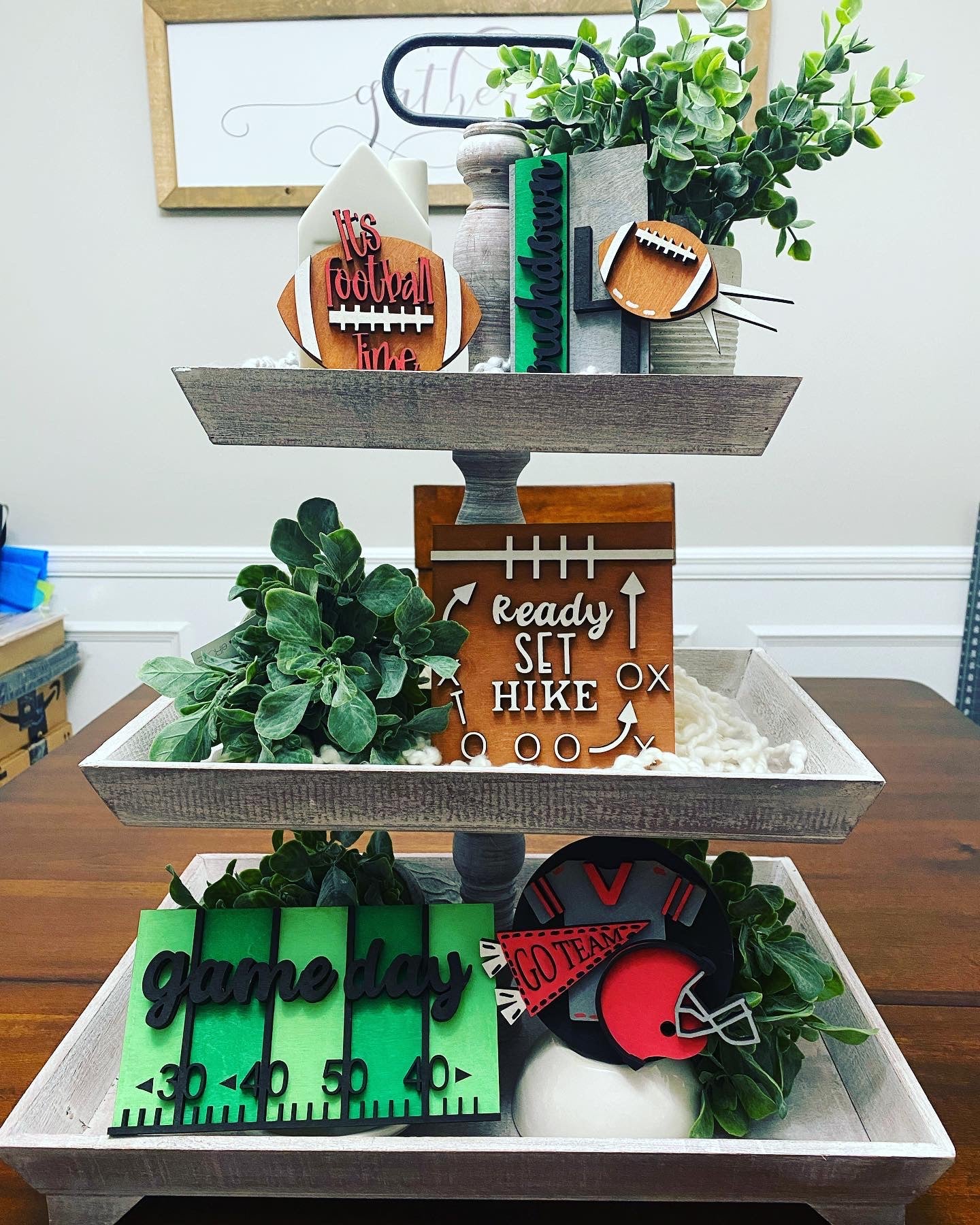 This DIY unfinished tiered tray set is perfect for football season and will add the perfect amount of cute to any room!